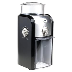 Combining the adjustable fineness selector of Krups's burr grinder with its built-in quantity control produces the perfectly tailored cup of joe. Start by choosing from 17 different textures ranging from very fine for espresso machines to very course for use in a French press. Next, determine the number of coffee drinkers and adjust the quantity setting accordingly. As the grinder begins its work, it uses a burr milling process to produce consistently ground beans while preserving the coffee's natural aroma. The machine automatically stops once the designated quantity has been achieved and the coffee extracts easily via a removable container. Topped with a large capacity hopper, the grinder fills effortlessly and provides easy access to its removable burr for cleaning. Measuring 10 by 4-1/2 by 5-1/2 inches, this tool comes with Krups's 1-year warranty. -- Amy Arnold Krups GVX2-12 Burr Grinder, Black and Metal. Grinding beans just before brewing ensures the best flavor. The best method of grinding is with a Krups burr grinder which produces a highly controllable texture without overheating the beans, 17 position finen